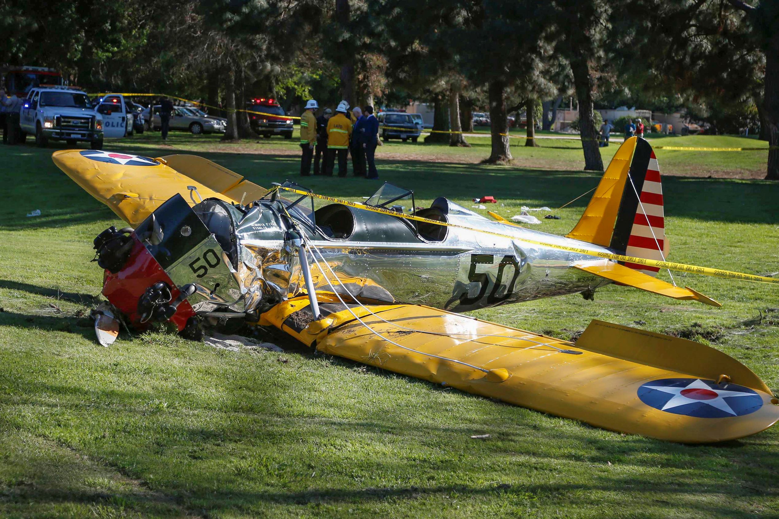© Lucy Nicholson/Reuters An airplane sits after crash landing at Penmar Golf Course in Venice California March 5, 2015. Celebrity web site TMZ reports the pilot was actor Harrison Ford, who was critically injured in the crash.